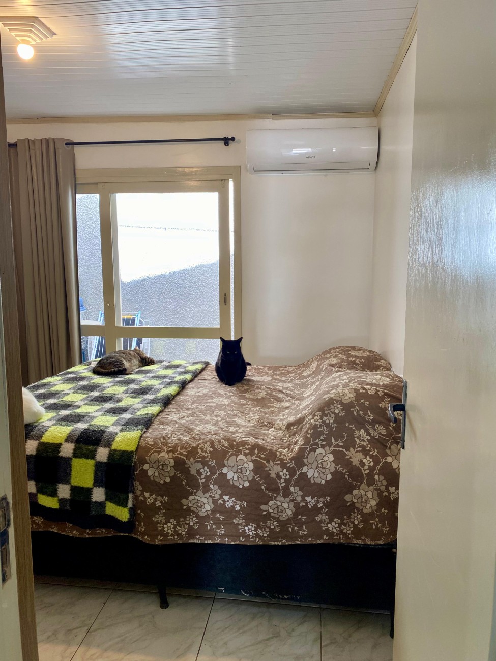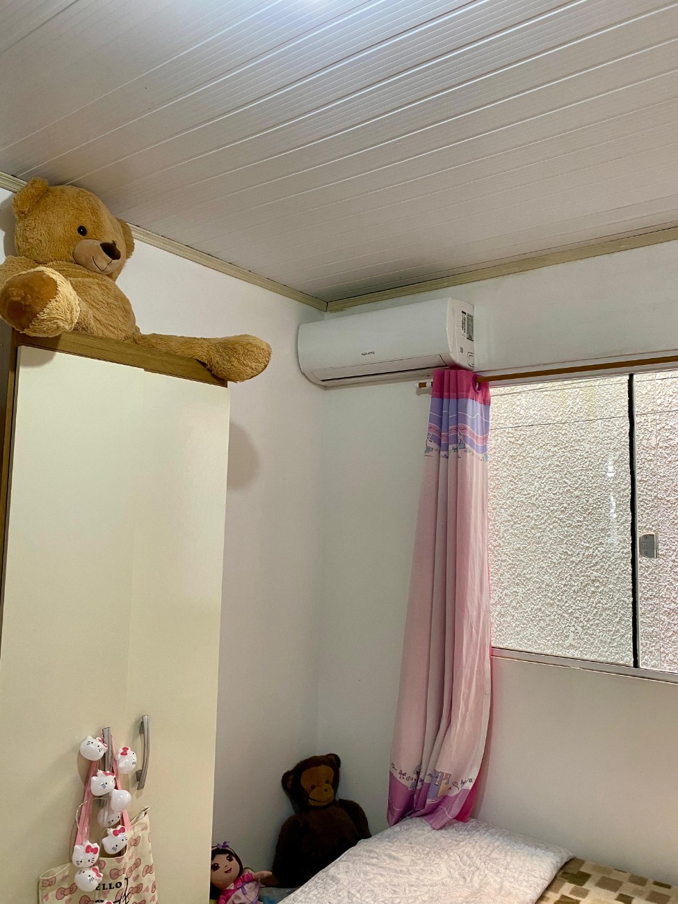 > 2 Ar condicionado Split, um de 18.000 Btus no quarto casal, outro de 9.000 Btus em um dos quartos menores.