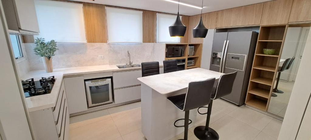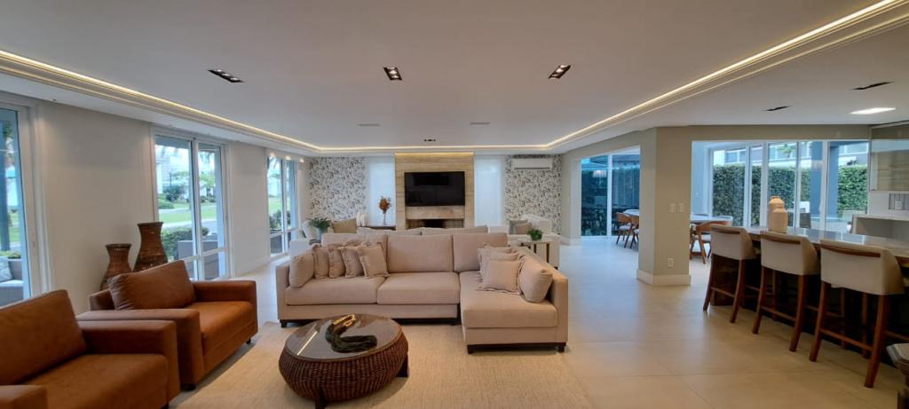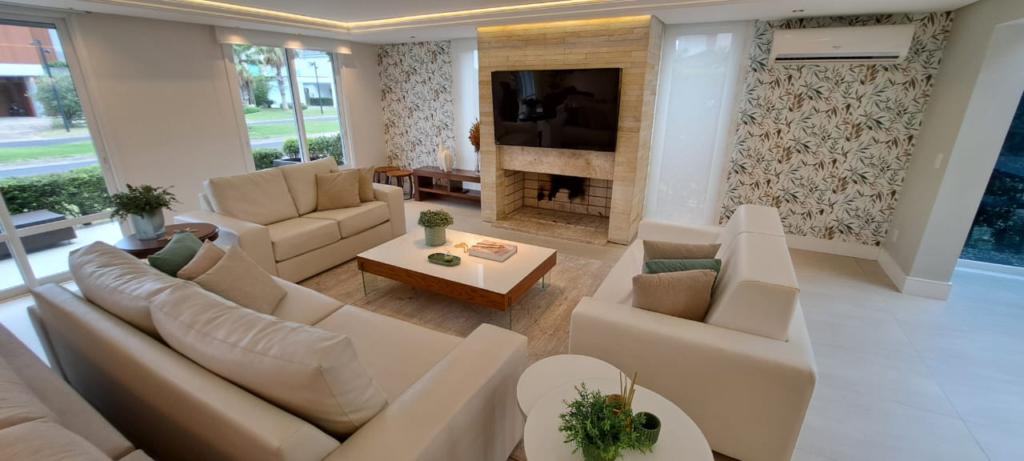 > Living amplo com lareira e espaço gourmet;