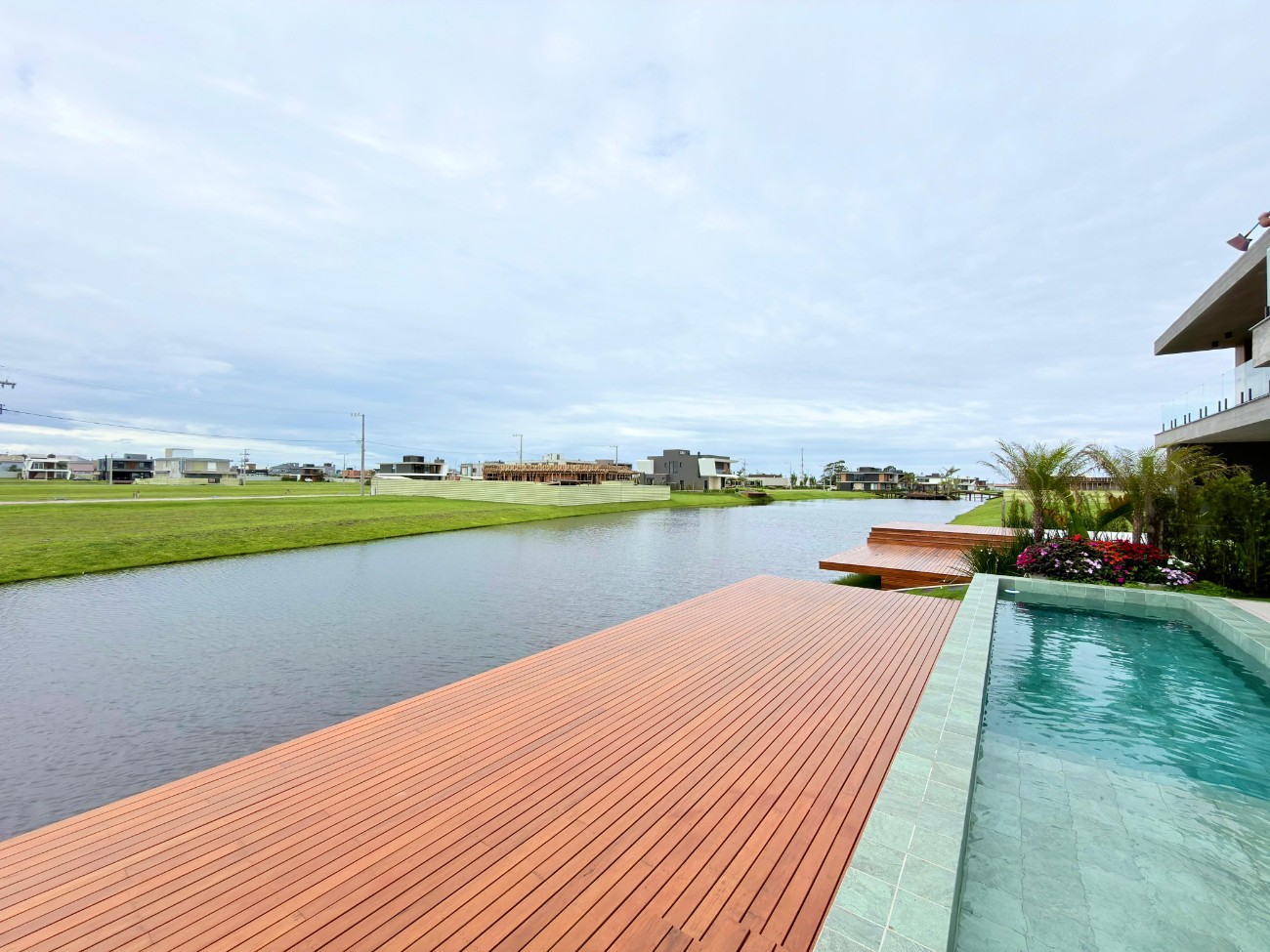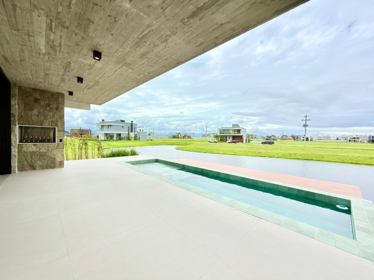 > Piscina de concreto iluminada com deck beira lago;