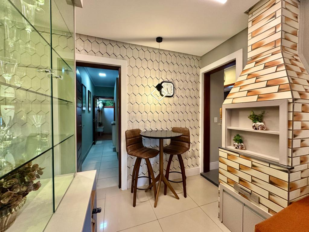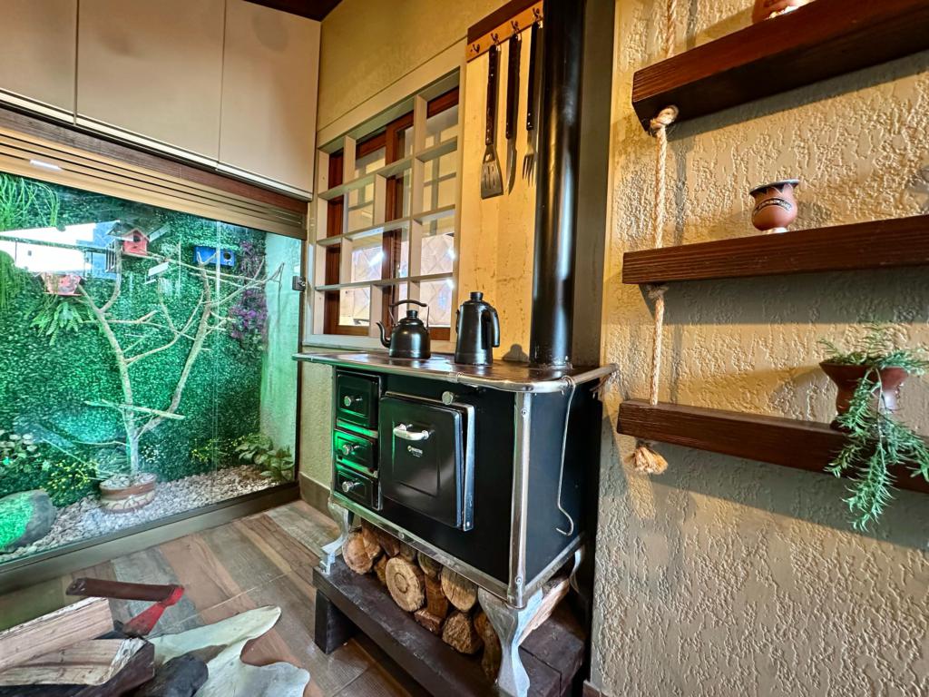 > Espaço gourmet com fogão a lenha;