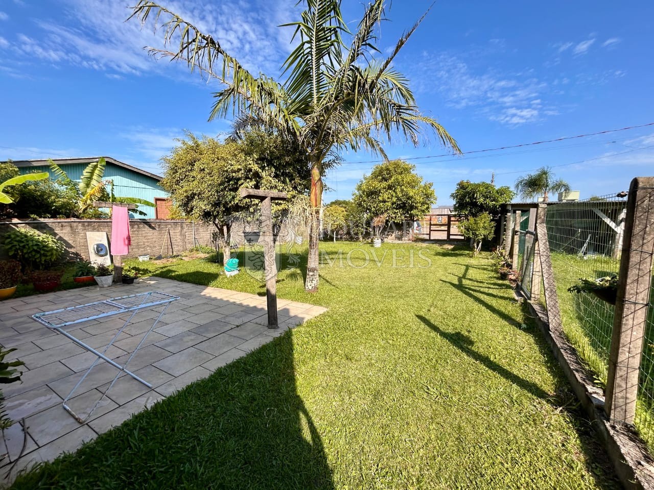 > Pátio gramado e com árvores;