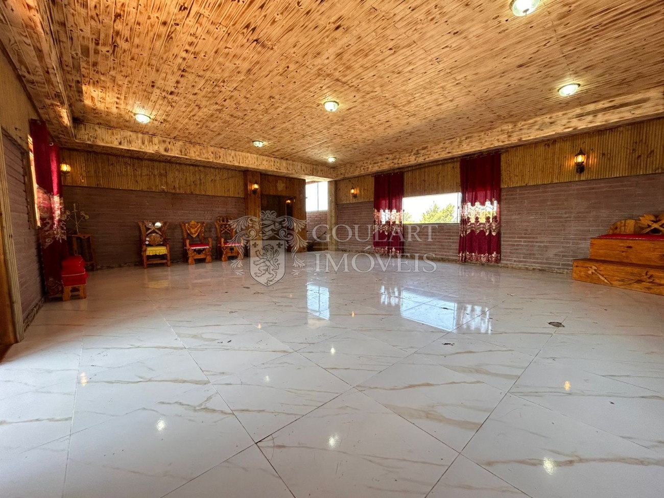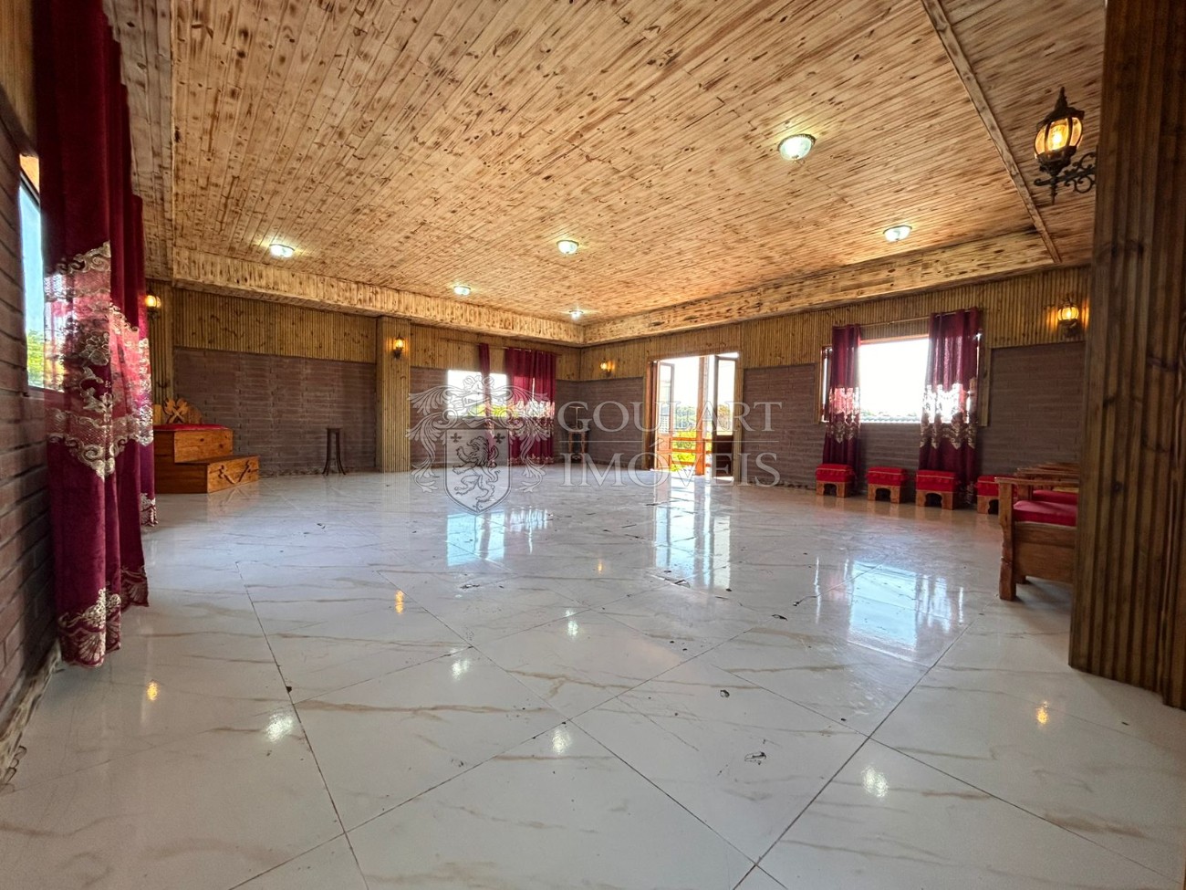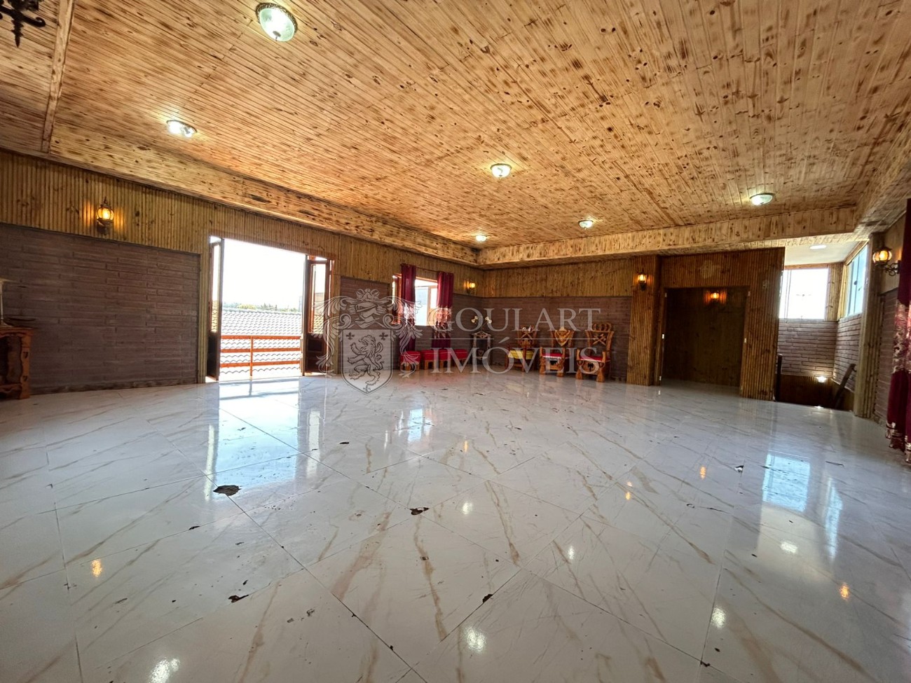 > Salão de festas com terraço coberto e sacada;