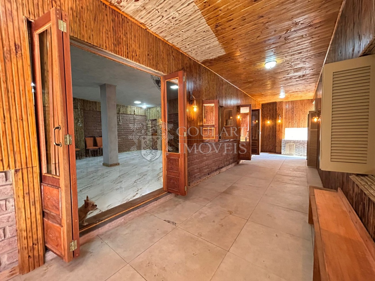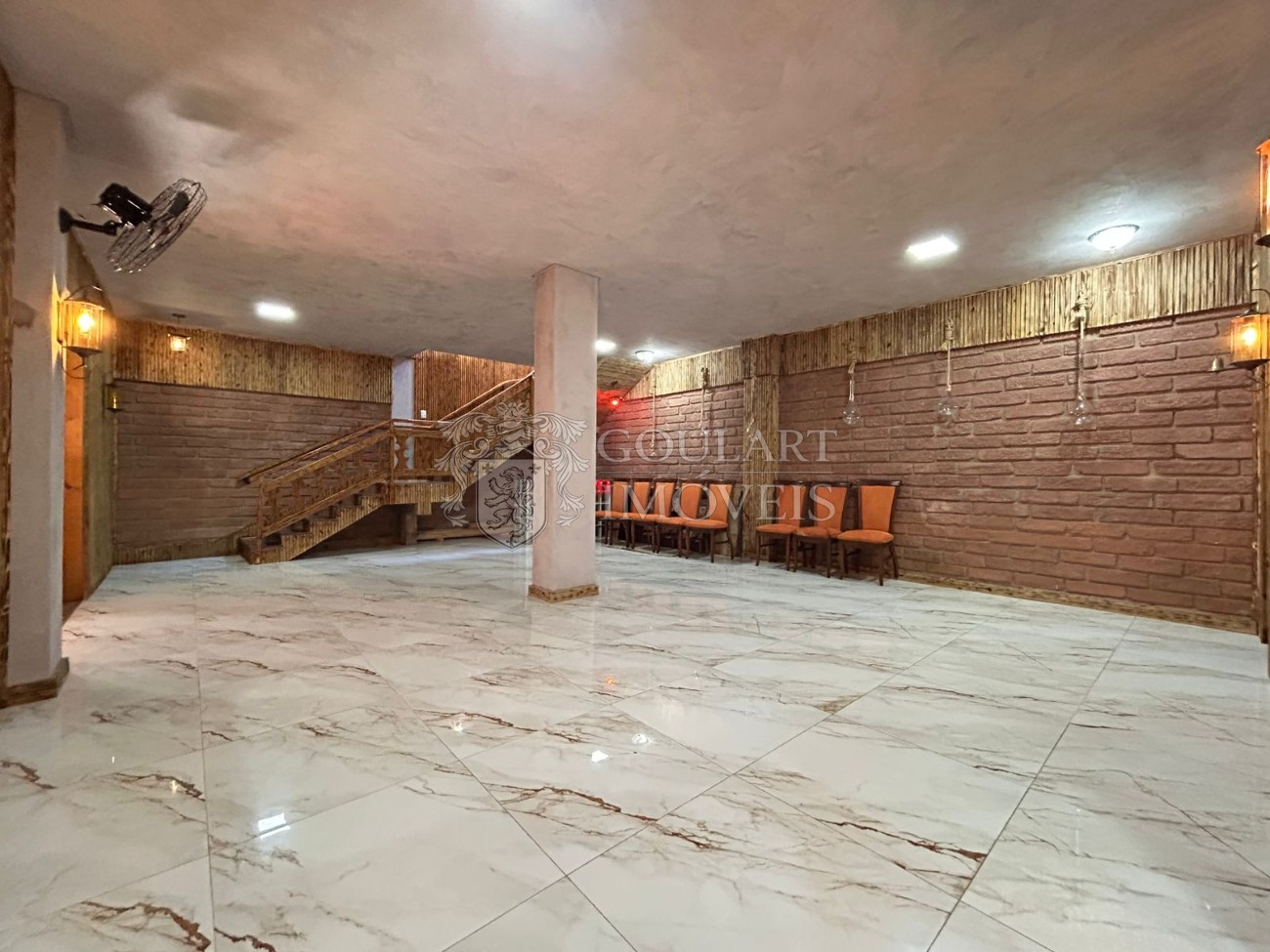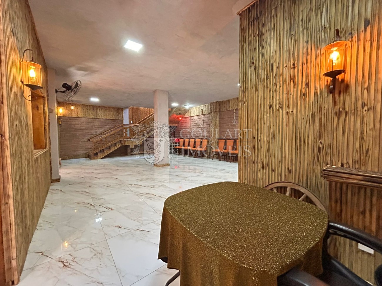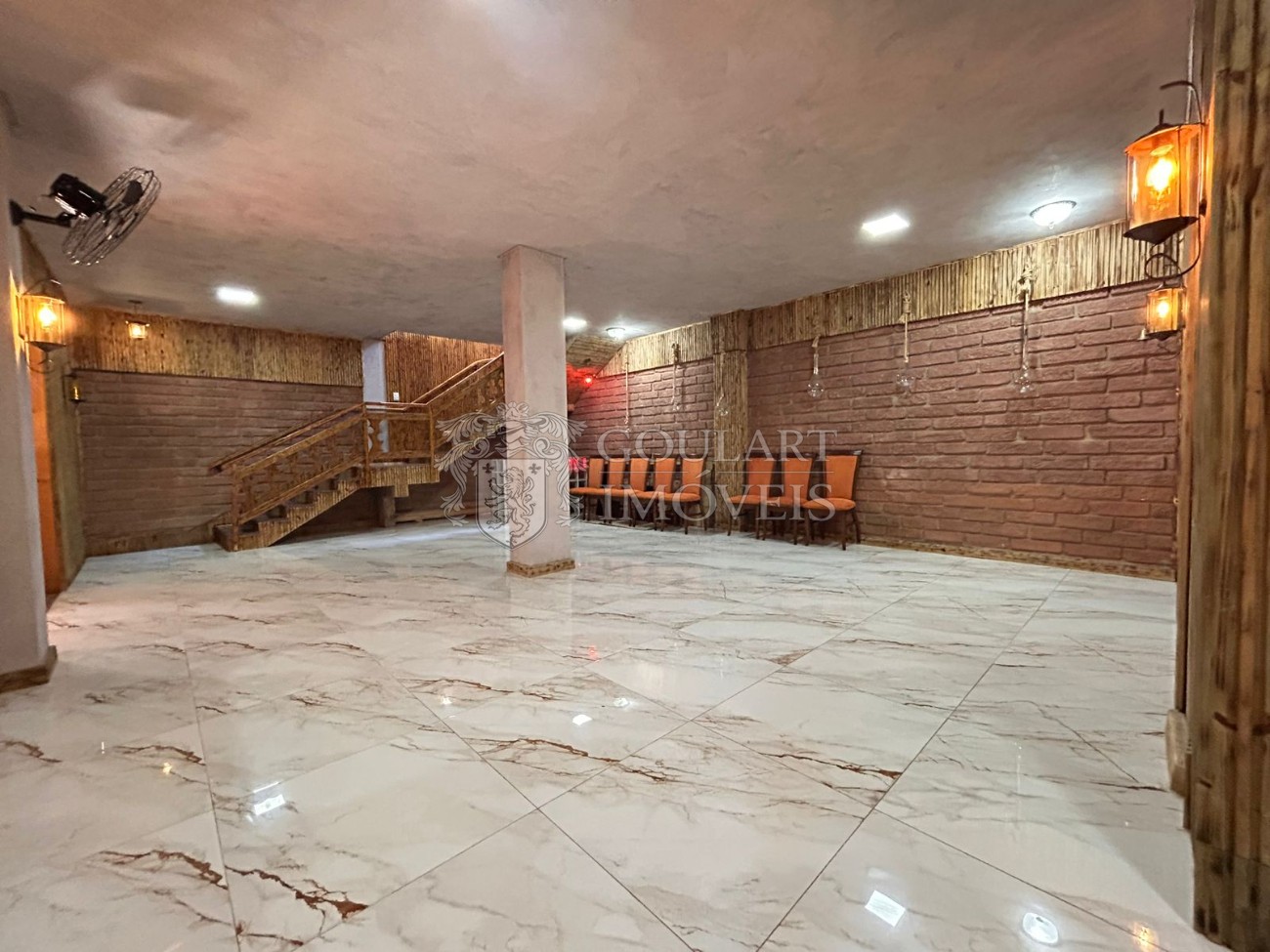 > Salão de festas com terraço coberto e sacada;