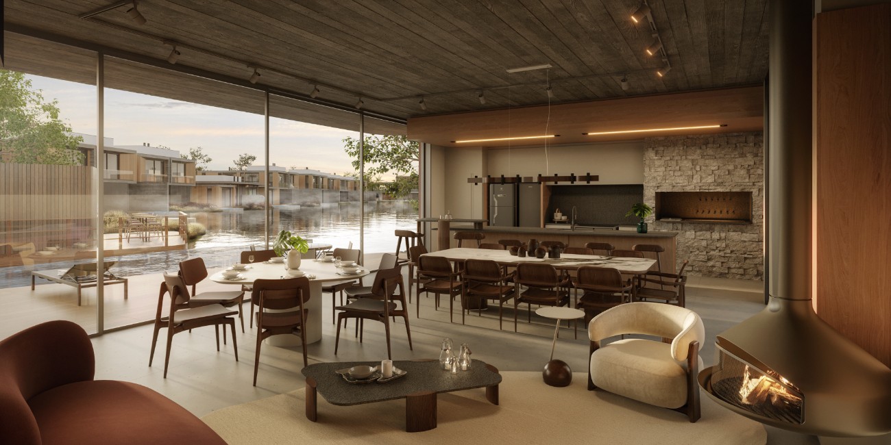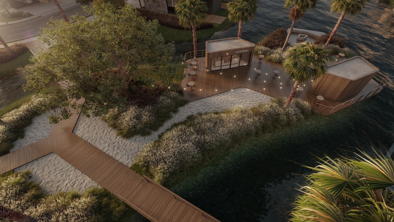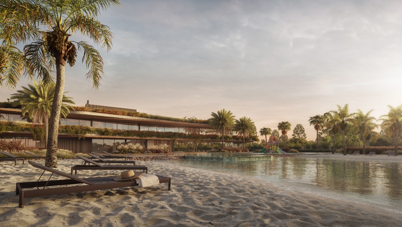 Infraestrutura de lazer completa com praia artificial privada, marina para jet ski e clube social de 3.000m².